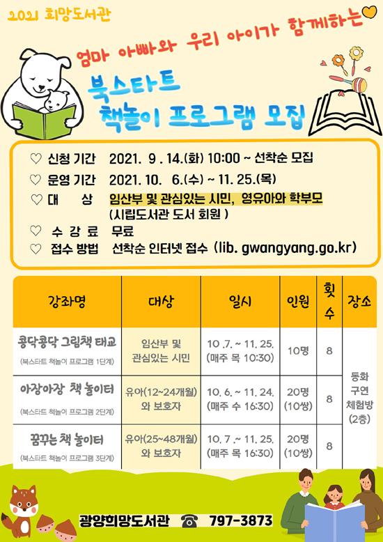 광양희망도서관이 오는 10월부터 광양시 거주 임산부와 영유아를 대상으로 ‘북스타트 책놀이 프로그램’을 운영한다고 28일 밝혔다.