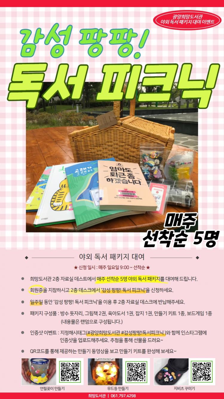 이 밖에도 독서피크닉에 참여하고 SNS에 #광양희망도서관, #감성팡팡!독서피크닉 해시태그와 함께 인증사진을 올리면 추첨을 통해 매달 2명에게 선물을 제공하는 이벤트도 운영 중이다.