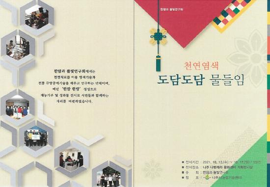 나주시는 ‘천연염색 도담도담 물들임’이라는 주제로 13일부터 17일까지 5일 간 나빌레라문화센터 기획전시실에서 한땀과 풀빛연구회 작품 전시회가 열린다고 밝혔다.