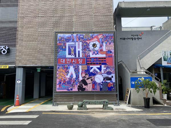 유지원 작가는 ‘전통시장’하면, 어릴 적 어머니의 푸짐한 시장바구니가 떠오른다는 점에 착안해 향수를 불러 일으키는 조형물 ‘장바구니’를 주차장 2층 외벽에 설치했다. 정승원 작가는 시장 곳곳을 누비며 즐기는 시민들을 담은 ‘대인시장’을 그려 방문객들에게 관심과 흥미를 더해 주고 있다.