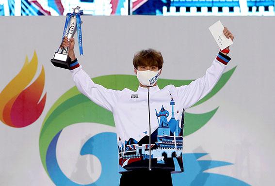 제102회 전국체육대회가 폐막한 14일 오후 경북 구미시 구미시민운동장에서 열린 폐회식에 참석한 수영 황선우가 MVP 트로피를 들고 기념촬영을 하고 있다. (사진=대한체육회 제공) 2021.10.14.