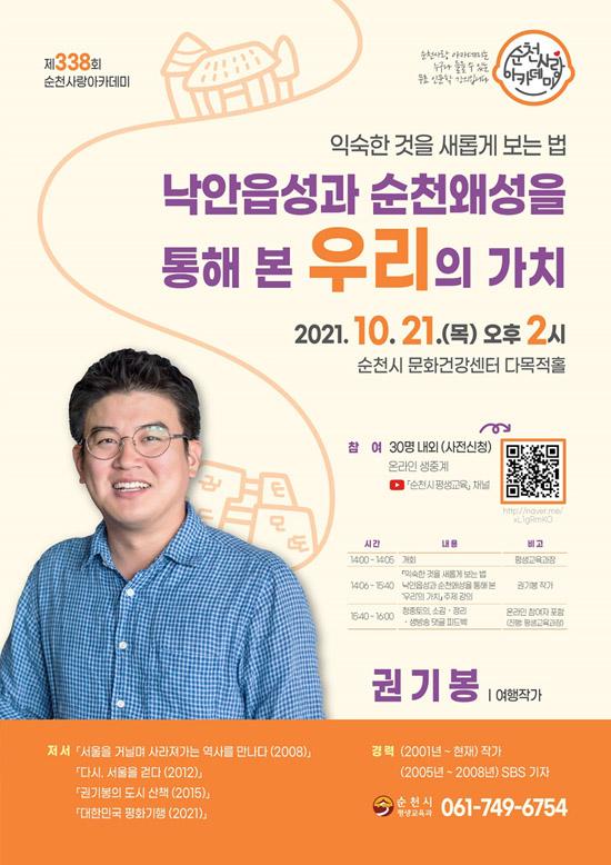 제338회 순천사랑아카데미는 작가이자 역사여행가로 명성이 높은 권기봉 작가를 초청하여 <익숙한 것을 새롭게 보는 법-낙안읍성과 순천왜성을 통해 본 ‘우리’의 가치>라는 주제로 진행된다.