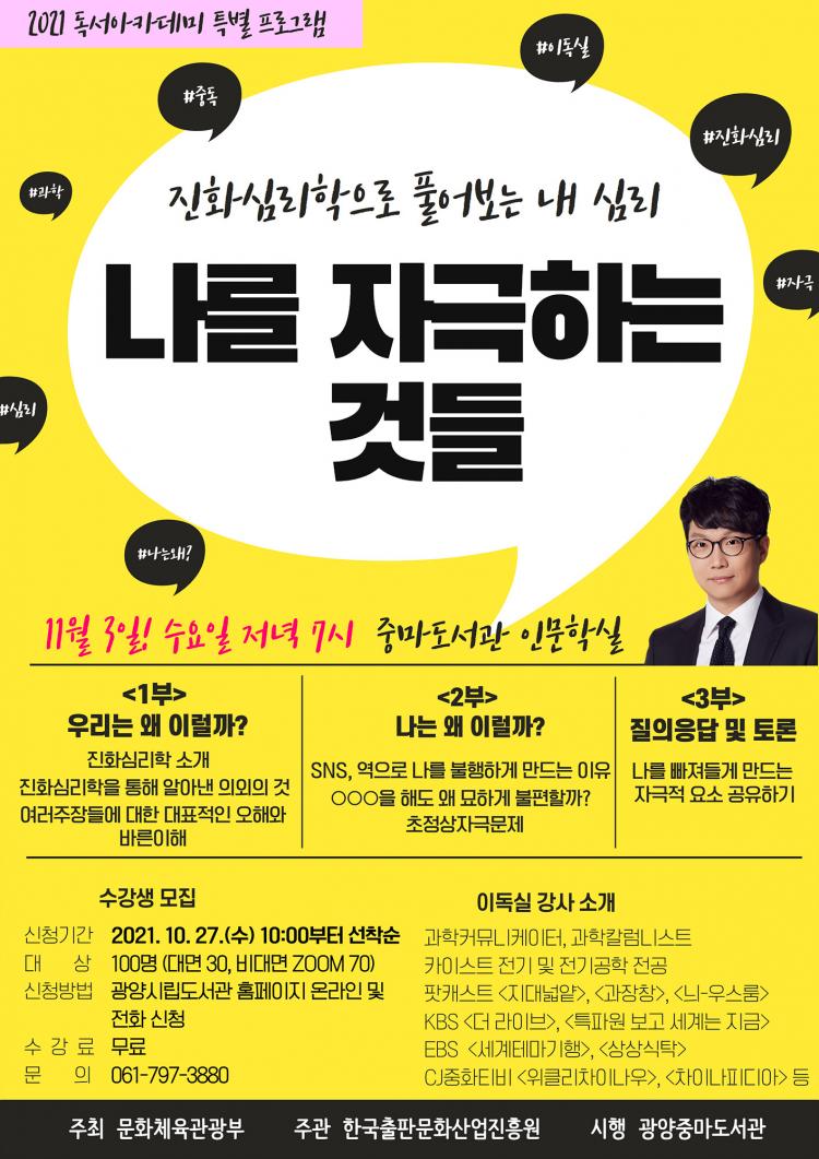 ‘2021 독서아카데미’ 추가 특별 프로그램 운영 기관으로 선정된 광양중마도서관이 이독실 과학커뮤니케이터를 도서관으로 초청해 오는 11월 3일 수요일 저녁 7시, ‘나를 자극하는 것들 – 진화심리학으로 풀어보는 내 심리’라는 주제로 강연을 연다.