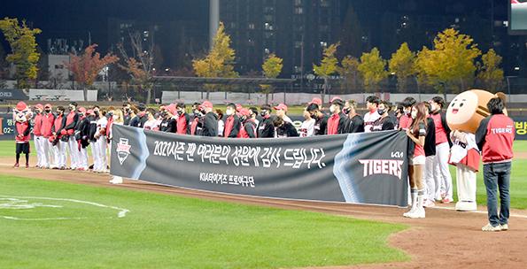 KIA 타이거즈 선수단이 30일 오후 광주 북구 광주-기아챔피언스필드에서 2021프로야구 마지막 경기를 치른 뒤 응원을 해준 팬들에게 인사를 하고 있다. 2021.10.30.