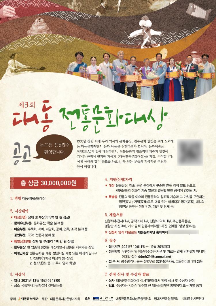 대동문화재단은 전통문화를 계승하고 발전시킨 장인들을 격려하기 위한 제3회 대동전통문화대상 후보자를 오는 20일까지 모집한다고 3일 밝혔다.