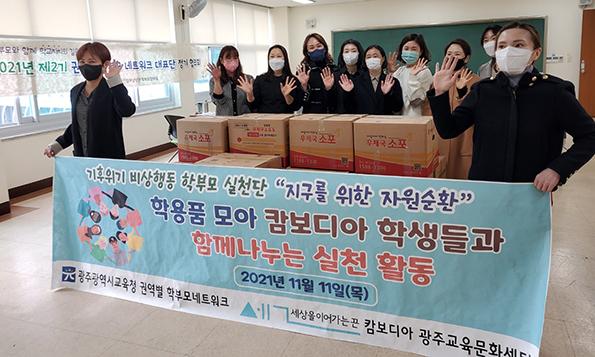 광주시교육청 소속 권역별 학부모 네트워크(광주 관내 초·중·고 학부모회장단 대표)가 11일 ‘기후위기 비상행동 학부모 실천단’ 활동의 일환으로 학용품 재활용 기부 행사를 진행했다.