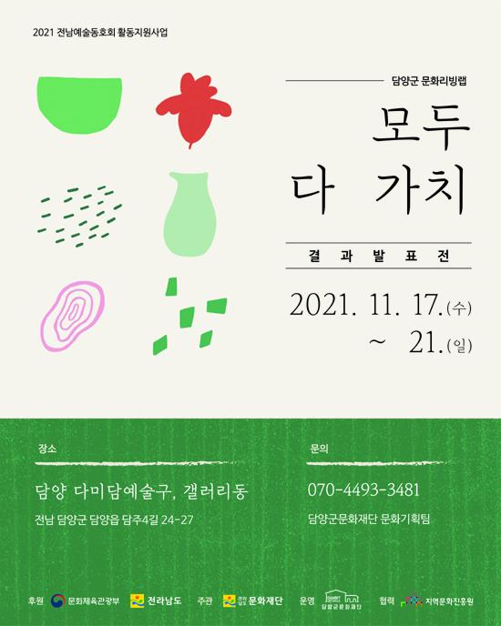 담양군문화재단은 17일부터 전남예술동호회 활동지원사업 담양군 문화리빙랩 ‘모두 다 가치’ 결과발표전을 진행한다.
