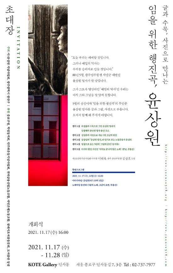 광주 광산구는 17일부터 서울 인사동에 위치한 KOTE(코트) 갤러리에서 윤상원 열사의 일대기 그림 전국 순회 전시회를 개최한다고 밝혔다. 광산구는 윤상원 열사의 삶, 정신을 예술로 승화시켜 5·18민주화운동의 상징 인물로 세우고자 지난 9월부터 전국 순회 전시를 추진하고 있다.
