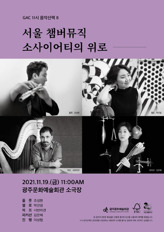 광주문화예술회관은 19일 오전 11시 광주문화예술회관 소극장에서 11시 음악산책 ‘서울 챔버뮤직 소사이어티의 위로’ 공연을 개최한다고 14일 밝혔다.