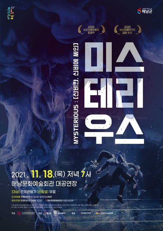 해남군은 18일 저녁7시 해남문화예술회관 대공연장에서 비보잉 크루‘구니스(goonies)’가 함께하는‘미스테리우스’ 공연을 선보인다. 이번 공연은 역동적이고 빠른 비보이에 전통음악과 랩, 미디어아트 등을 결합한 복합예술공연으로 화려하게 꾸며진다. 상모를 돌리며 부채를 들고 추는 비보잉은 전통과 현대가 절묘하게 만나 다채로운 볼거리를 제공할 예정이다.