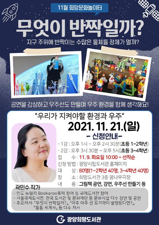 희망문화놀이터는 ‘문화가 있는 날’ 활성화를 위해 매달 주제를 정해 어린이를 위한 인형극, 놀이극, 북콘서트 등으로 다양하게 풀어내는 문화행사이다. 이번 달에는 ‘우리가 지켜야 할 환경과 우주’를 주제로, 늘어만 가는 우주 쓰레기에 대해 곽민수 작가와 함께 생각해 보는 시간을 가질 계획이며 1, 2강으로 나눠 1강은 초등 1~2학년, 2강은 초등 3~4학년을 대상으로 운영한다.