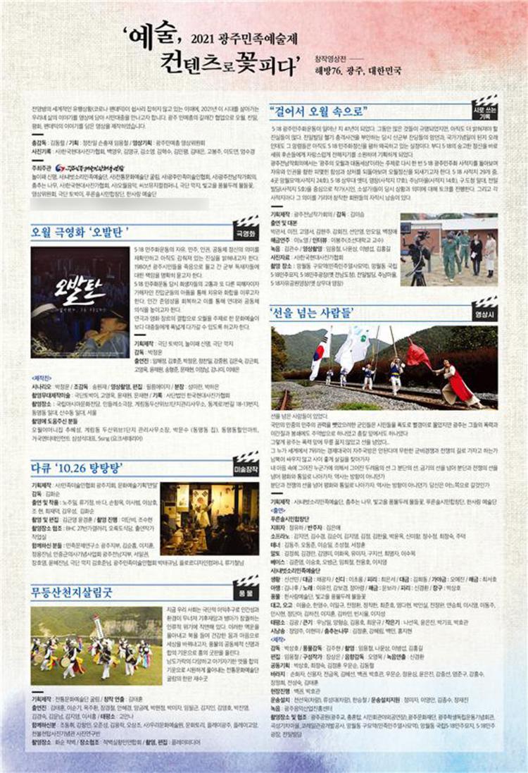 광주민족예술인단체총연합(광주민예총)이 1년여를 공들여 제작한 '극영화' '시' '미술' 등 5작품이 영상을 통해 소개된다.