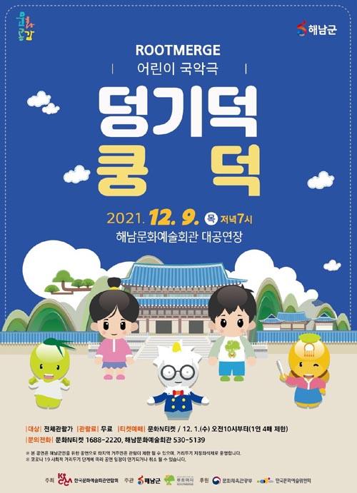 해남군은 9일 해남문화예술회관 대공연장에서 그룹‘루트머지’와 함께하는 어린이 국악극‘덩기덕쿵덕’공연을 선보인다.