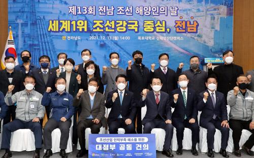 전남도는 13일 목포대학교 신해양산단캠퍼스에서 '제13회 전남 조선·해양인의 날' 기념식을 갖고 조선인력 부족 해소를 위한 대정부 공동건의문을 채택했다.