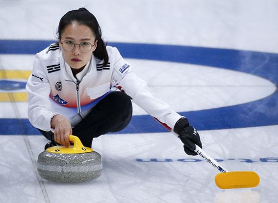 한국 여자 컬링 스킵 김은정이 5일(현지시간) 캐나다 앨버타주 캘거리에서 열린 세계컬링연맹(WCF) 여자 컬링 선수권 대회 예선 9차전 덴마크와 경기 중 샷하고 있다. 스킵 김은정, 리드 김선영, 세컨드 김초희, 서드 김경애, 후보 김영미로 이뤄진 '팀 킴'은 덴마크(팀 두폰트)에 4-6으로 패해 3승 6패 공동 10위를 기록했다. 2021.05.06.