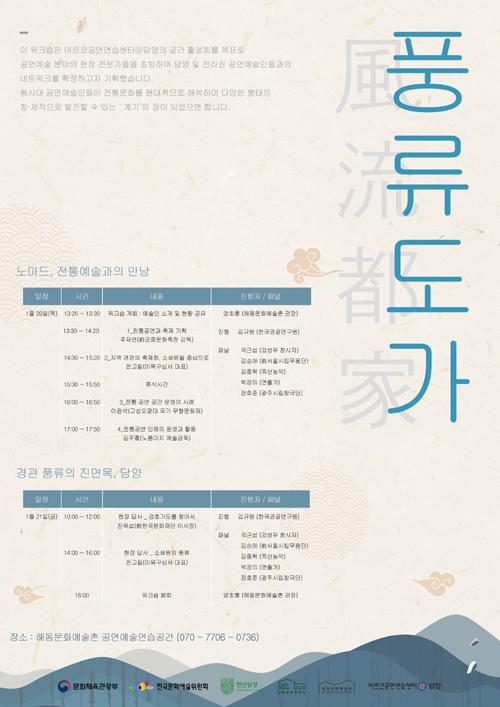 오는 20일과 21일에 거쳐 진행하는 워크숍은 총 3부로 구성해 1부에서는 전통공연과 축제, 전통공연 단체의 운영과 활동 등 전통예술에 관한 토론이 이루어지며, 2부에서는 현재 활동 중인 공연예술인들의 경험을 공유하며 다양한 콘텐츠를 모색한다.