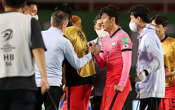 7일 오후 경기 안산시 단원구 안산와스타디움에서 열린 '2022 카타르월드컵 아시아지역 최종예선' 3차전 대한민국과 시리아의 경기. 경기를 마친 손흥민이 파울루 벤투 감독과 손을 맞잡고 있다. 2021.10.07.