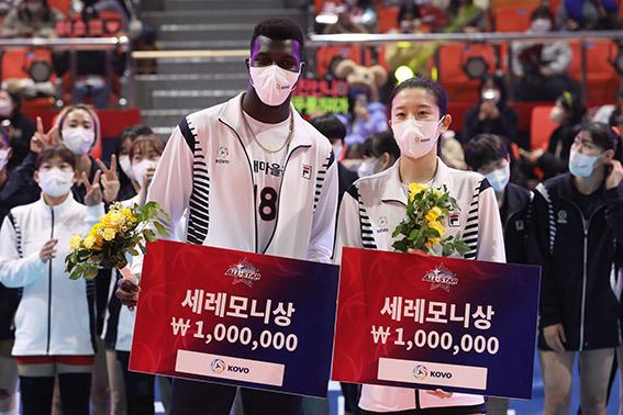 23일 오후 광주 서구 염주종합체육관에서 열린 '도드람 2021-2022 V리그 올스타전'에서 케이타, 이다현이 세레모니상을 받은 후 기념촬영을 하고 있다. 2022.01.23.