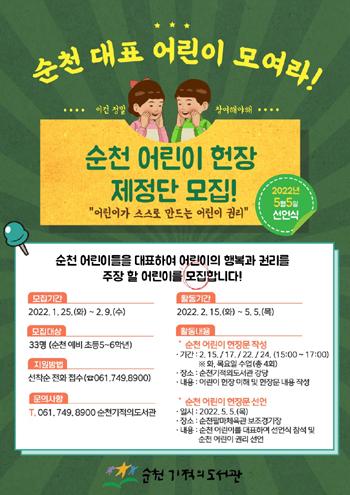 순천시는 2022년 어린이날 선포 100주년을 기념해 순천 기적의도서관에서 어린이의 행복과 권리를 주장할 순천 대표 어린이 33인을 모집한다고 3일 밝혔다.