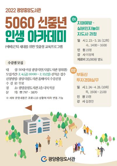 광양중앙도서관은 5060 은퇴(은퇴 준비자 포함) 세대를 대상으로 한 교육 프로그램으로 상반기 ‘5060 신중년 인생 아카데미’를 운영하기로 하고, 프로그램에 참여할 수강생을 모집한다.