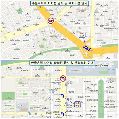 광주 서구 한국은행 사거리(소각장 방향)와 남구 주월교차로(농성역→백운초교 방향) 좌회전이 오는 10일부터 금지된다.