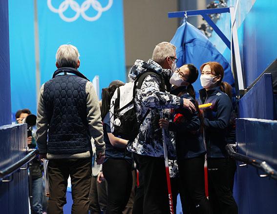 17일 중국 베이징 내셔널 아쿠아틱 센터에서 열린 2022 베이징 동계올림픽 컬링 여자 한국과 스웨덴의 경기, 대한민국 팀킴 피터 갤런트 감독과 김은정이 4대8로 패한 뒤 경기장을 나서며 포옹하고 있다. 오른쪽은 김초희. 2022.02.17.