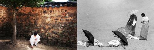 ▲송창근作 ‘소쇄원 애양단’(왼쪽), 전오남作 ‘담양 쌍교-모래찜질하는 여인들’.