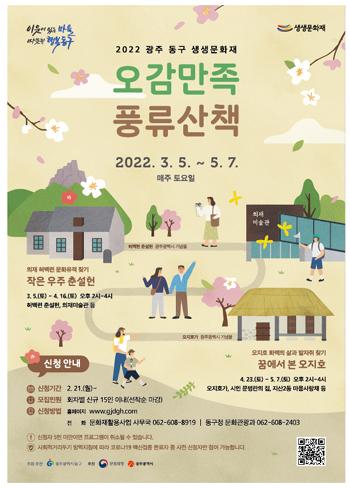 광주 동구는 지역이 간직한 문화재를 직접 찾아다니며 문화재의 멋과 매력을 알아가는 ‘오감만족 풍류산책’ 프로그램을 3월 5일부터 5월 7일까지 2개월간 매주 토요일에 진행한다고 밝혔다.