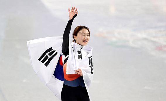 16일 오후 중국 베이징 캐피털 실내경기장에서 열린 2022 베이징동계올림픽 쇼트트랙 여자 1500m 결승, 금메달로 올림픽 2연패를 달성한 최민정이 태극기를 들고 기뻐하고 있다. 2022.02.16.