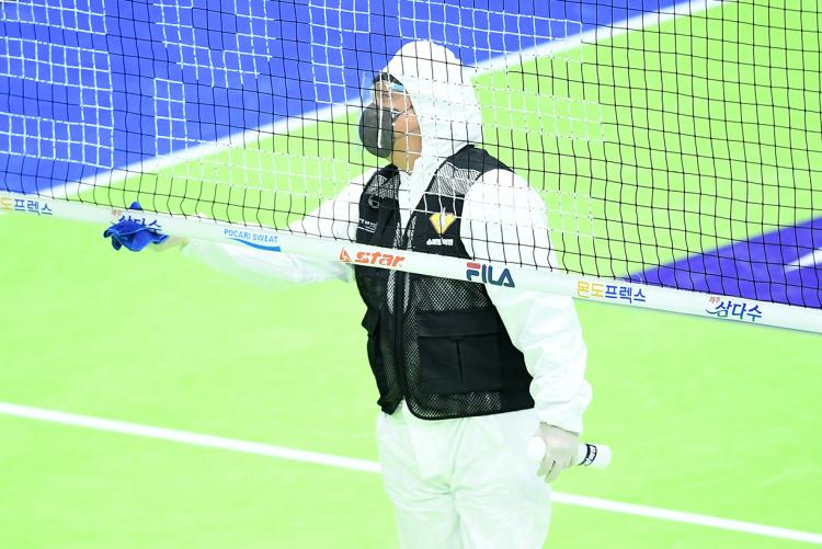 코트 위에서 진행되는 방역.(사진=한국배구연맹 제공)