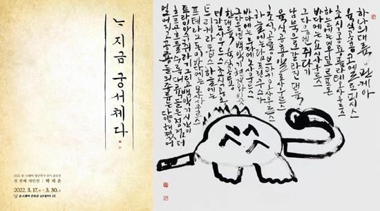 ‘나 지금 궁서체다’라는 주제로 열리는 이번 전시는 어릴 때부터 서예를 익힌 박 작가의 첫 번째 개인전으로 궁서체를 표현한 작품이 선보인다. 또 정형화된 궁서체의 표현양식을 탈피하고 현재 궁서체가 가지고 있는 의미를 느낄 수 있는 작품이 펼쳐진다.