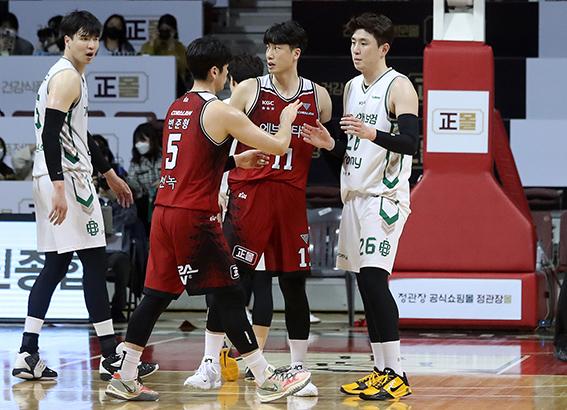 17일 오후 경기 안양실내체육관에서 열린 2021-2022 KBL 정관장 프로농구 안양 KGC 인삼공사와 원주 DB 프로미의 경기 4쿼터 경기 종료 직전, 선수들이 인사하고 있다. 이날 경기는 안양 KGC 인상공사가 93대 84로 승리했다. 2022.03.17.