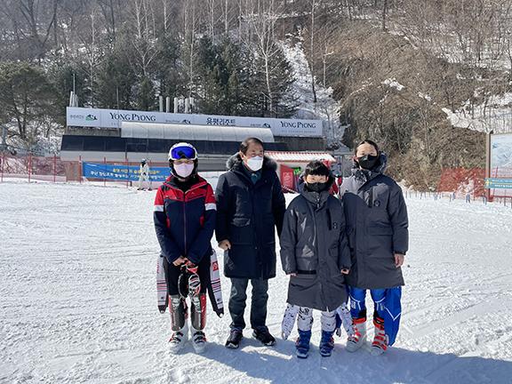 김재무 회장이 알파인 스키3인방을 격려하고 있다. 왼쪽부터 강다현, 김재무회장, 박건태, 박교리. /전남체육회 제공