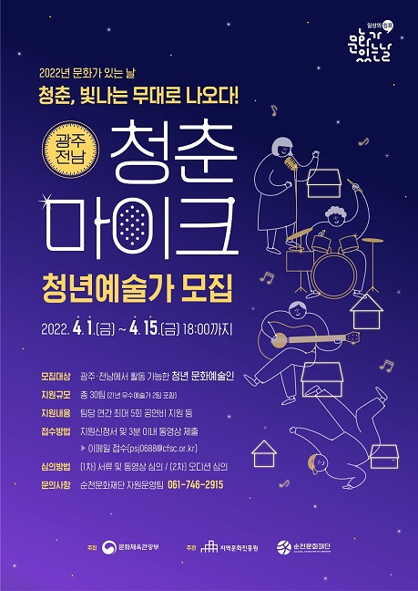 순천문화재단은 청년들의 꿈을 키우고 전문성을 가진 예술가로의 성장을 돕기 위한 ‘2022년 문화가 있는 날 <청춘마이크_광주전남>’ 청년예술가 30팀을 오는 15일까지 공개 모집한다고 밝혔다.