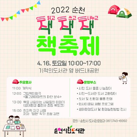 순천시는 12일부터 18일까지 제58회 도서관주간을 맞아 ‘2022 순천 책·책·책 책축제’를 포함하여 다양한 독서문화 행사를 마련했다.