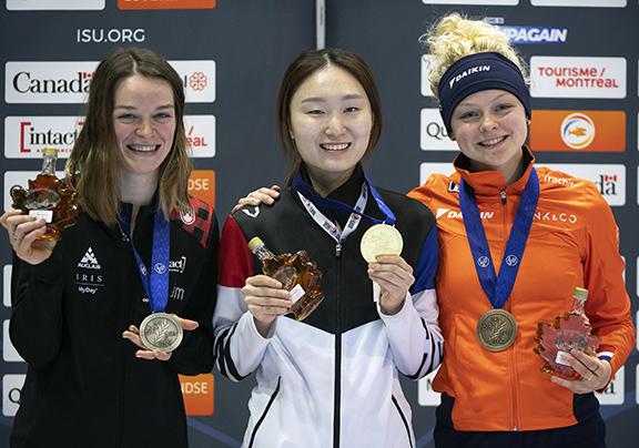 최민정(가운데)이 10일(현지시간) 캐나다 몬트리올의 모리스 리처드 아레나에서 막을 내린 2022 국제빙상경기연맹(ISU) 쇼트트랙 세계선수권대회 종합우승 메달을 들고 포즈를 취하고 있다. 2022.04.11.