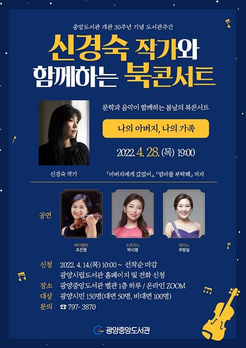 이번 문화행사는 학생과 직장인 등 도서관 이용이 어려운 시민을 위해 야간에 운영하며 ‘나의 아버지, 나의 가족’을 주제로 강연과 음악 공연이 함께 어우러지는 도서관 북콘서트로 진행한다.