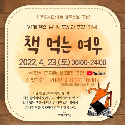 광양용강도서관은 4월 도서관주간(4월 12~18일)과 세계 책의 날을 기념해 4월 23일에 어린이와 가족이 함께 관람할 수 있는 가족 뮤지컬 ‘책 먹는 여우’ 공연을 준비했다.