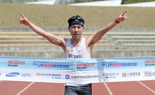 24일 오후 전남 나주종합스포츠파크에서 열린 뉴시스 광주전남본부 주최·나주 마라톤동호회 주관 \'제 8회 나주영산강마라톤대회\'에서 풀코스(42.195㎞) 남자 1위 고영석씨가 결승선을 통과하고 있다. 2022.04.24.