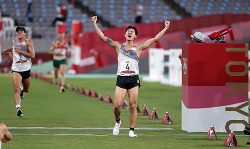 전웅태가 7일 오후 일본 조후 도쿄 스타디움에서 열린 근대5종경기 남자 개인 레이저런에서 3위로 들어오며 포효하고 있다. 2021.08.07.