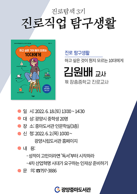 광양중마도서관은 오는 18일과 25일, 2회에 걸쳐 진로 탐색 3기 ‘진로직업 탐구생활’을 운영한다.