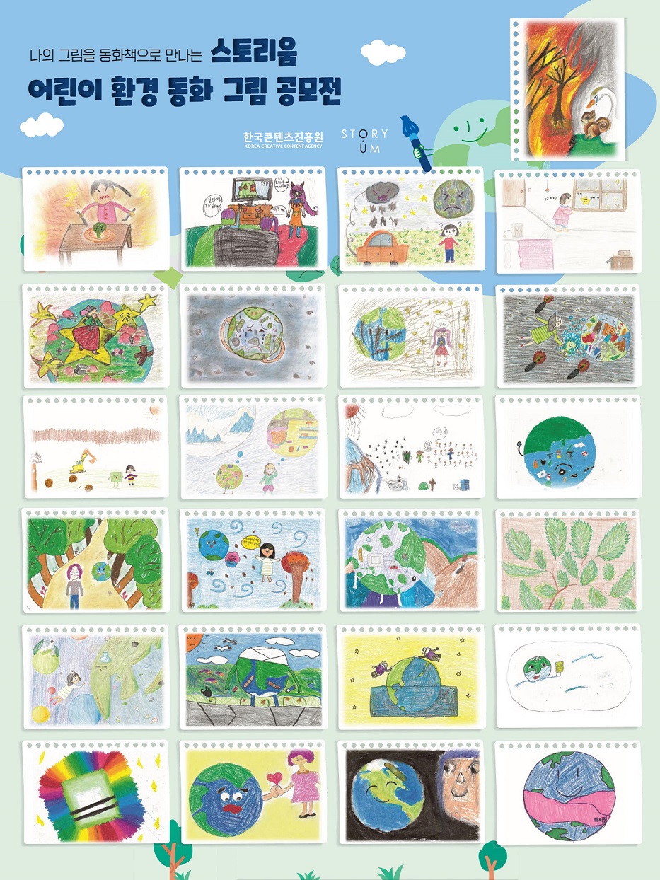 어린이들이 그린 그림 25점이 \'대한민국 콘텐츠 대상 청년작가상\'을 수상한 김고은 작가의 환경 동화 \'지구 때타올 대소동\'의 삽화로 쓰인다.