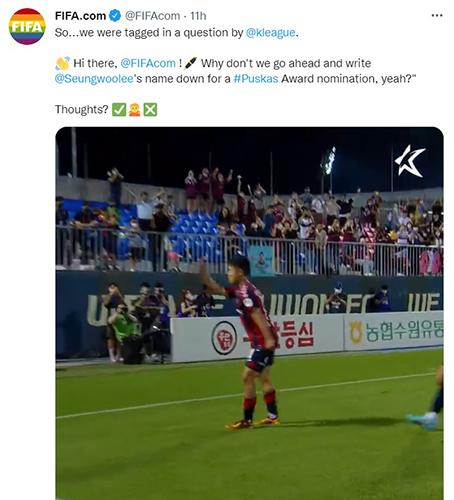 FIFA는 SNS에 이승우의 골 장면과 함께 \"K리그로부터 질문을 받았다. K리그가 우리를 태그해 이승우의 골이 \'푸스카스상\'으로 어떤지 물었다\"고 썼다.