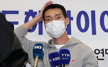 다이아몬드리그 개막전 남자 높이뛰기에서 우승을 차지한 우상혁이 19일 오후 인천국제공항을 통해 귀국한 후 인터뷰 준비를 하고 있다. 2022.05.19.