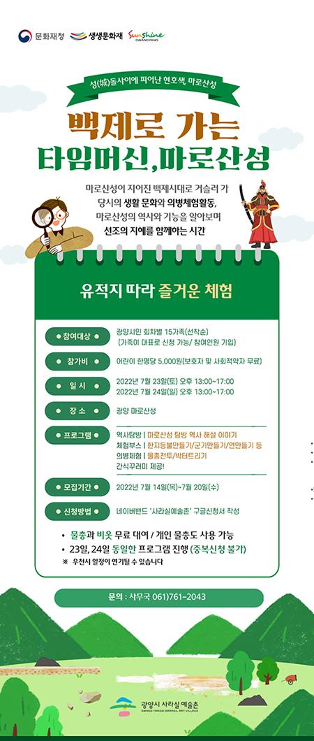 ‘백제로 가는 타임머신, 마로산성’은 7월 23, 24일 오후 13~17시 2회 개최하며, 참여 신청 등 자세한 사항은 포스터를 참고하거나 광양시사라실예술촌 사무국으로 문의하면 알 수 있다. /광양=조순익 기자