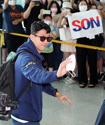 쿠팡플레이 초청 시리즈를 마친 영국 프리미어리그 토트넘 홋스퍼의 손흥민이 17일 오후 인천국제공항 제2여객터미널을 통해 출국하며 팬들에게 인사를 하고 있다.(공동취재사진) 2022.07.17.