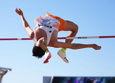 우상혁이 18일(현지시간) 미 오리건주 유진의 헤이워드 필드에서 열린 세계육상선수권대회 남자 높이뛰기 결선 경기 중 바를 넘고 있다. 우상혁은 2m35를 넘어 한국 육상 높이뛰기 최초로 세계선수권 은메달을 목에 걸었다. 2022.07.19.