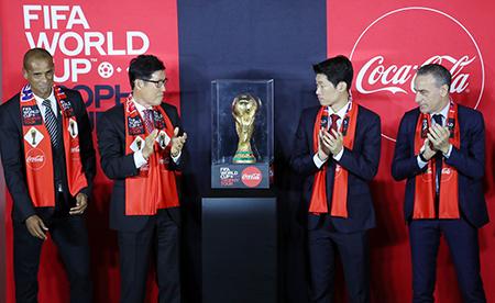 월드컵 스폰서 코카콜라는 24일 오후 서울 영등포구 여의도 더현대 서울 5층 사운드 포레스트에서 \'FIFA 월드컵 카타르 2022 트로피 투어\'의 일환으로 전세기를 타고 이날 한국에 도착한 월드컵 트로피의 미디어 행사를 진행했다.