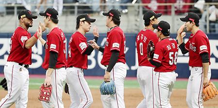 21일 오후 서울 구로구 고척스카이돔에서 열린 2022 KBO리그 SSG 랜더스와 키움 히어로즈의 경기, SSG 선수들이 키움에 6-1 승리를 거둔 뒤 기뻐하고 있다. 2022.08.21.