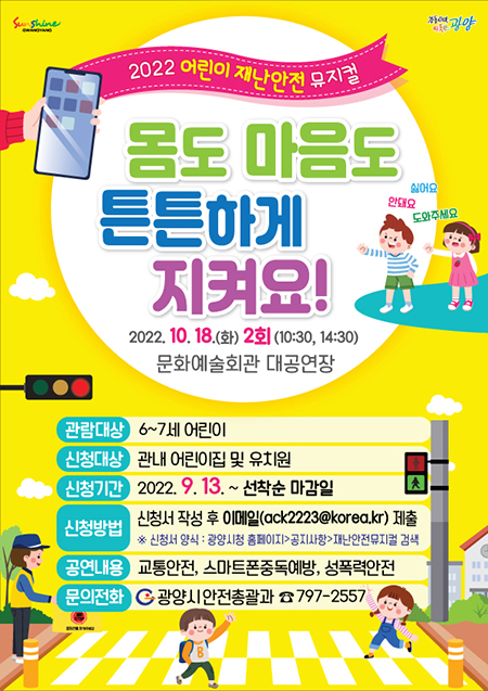 광양시가 오는 10월 18일 2회에 걸쳐 문화예술회관 대공연장에서 어린이 재난안전뮤지컬 ‘몸도 마음도 튼튼하게 지켜요!’ 공연을 개최한다.